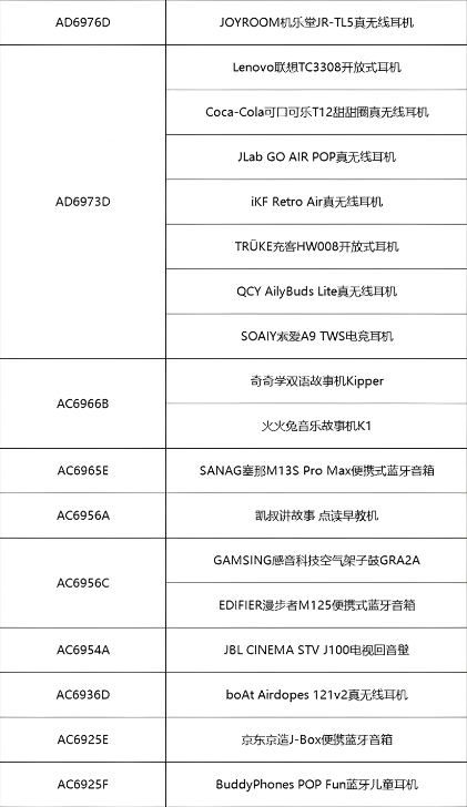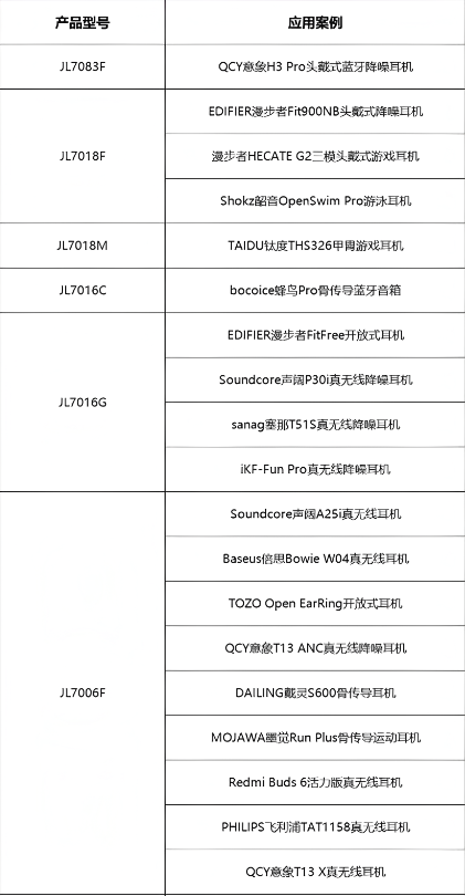 Redmi、JBL、EDIFIER漫步者、Shokz韶音、Baseus倍思、QCY意象、Soundcore聲闊、小度、TOZO、Lenovo聯想、PHILIPS飛利浦、boAt、TAIDU鈦度、bocoice蜂鳥、SANAG塞那、iKF、DAILING戴靈、MOJAWA墨覺、Haier Bros.海爾兄弟、象鼻子、JOYROOM機樂堂、Coca-Cola可口可樂、JLab、TRüKE充客、SOAIY索愛、奇奇學、火火兔、凱叔講故事、百詞斬、GAMSING感音科技、京東京造、BuddyPhones在內的32大品牌旗下46款產品,采用了杰理科技的方案。